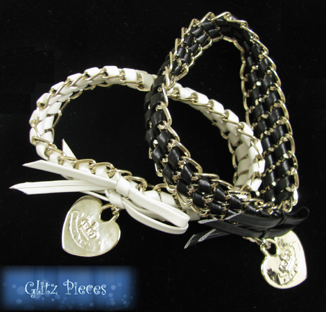 Try this leather and gold bracelet. The leather is braided along the champagne-gold plated chain. Available in black and white.